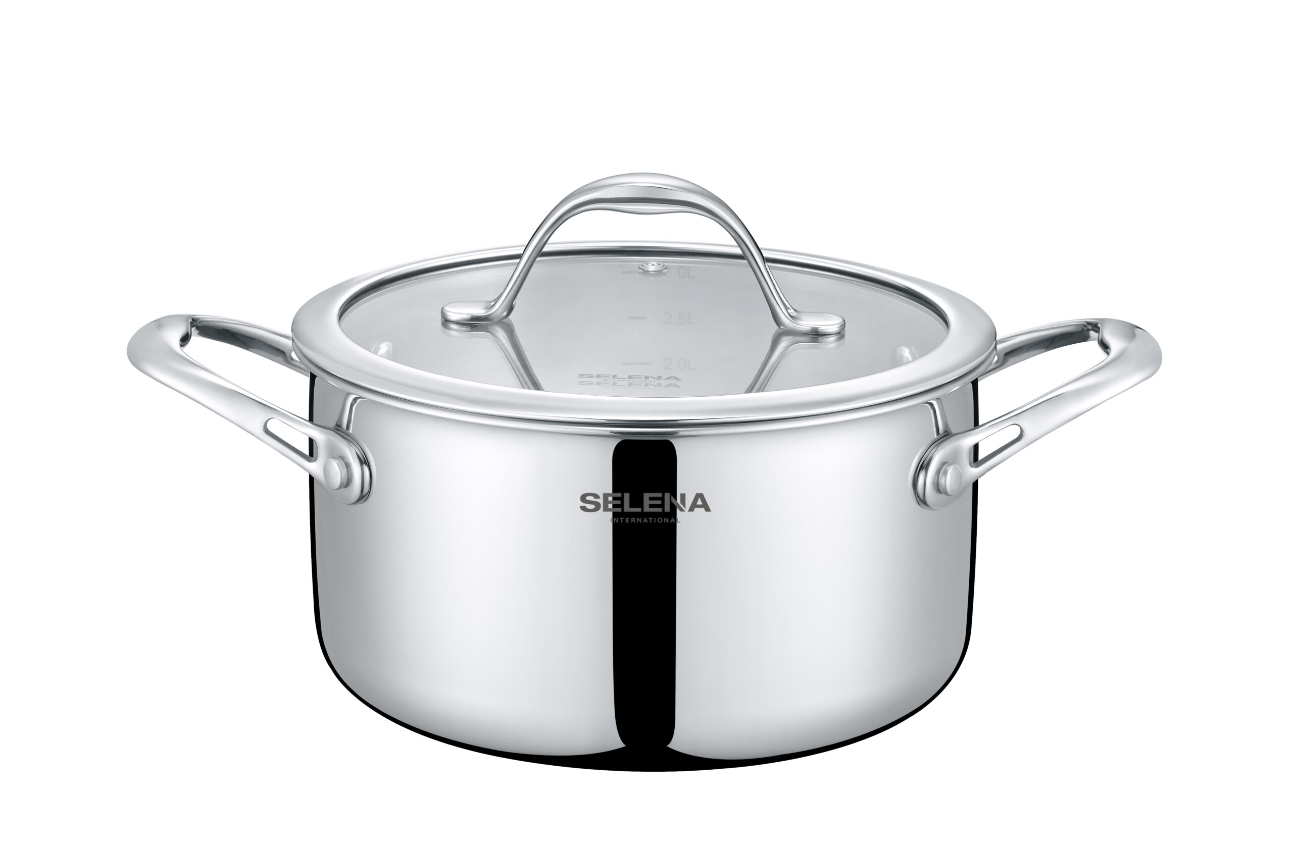 Кастрюля 20х11см/3,3л со стеклянной крышкой. Трехслойный корпус, толщина 2,5мм, литое индукционное дно. Материал: нержавеющая сталь 18/10, стекло. Полирование: зеркальное.