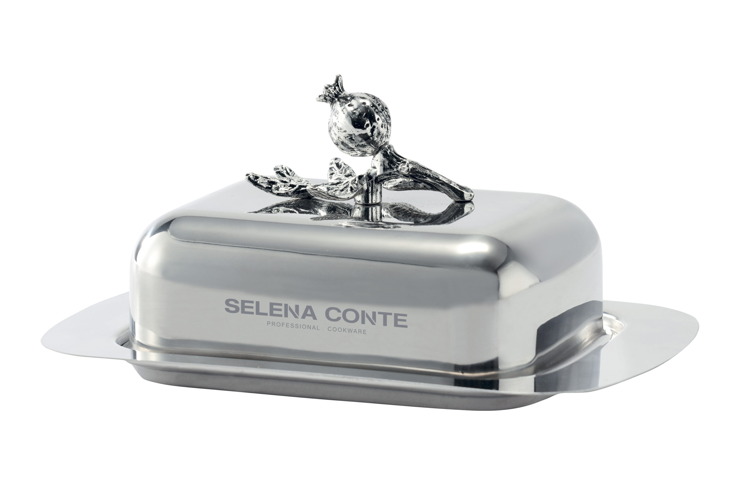 Масленка 18,5х12х9,5см. Декор: гранат. Материал: нержавеющая сталь 18/10, цинковый сплав. Цвет декора: стальной