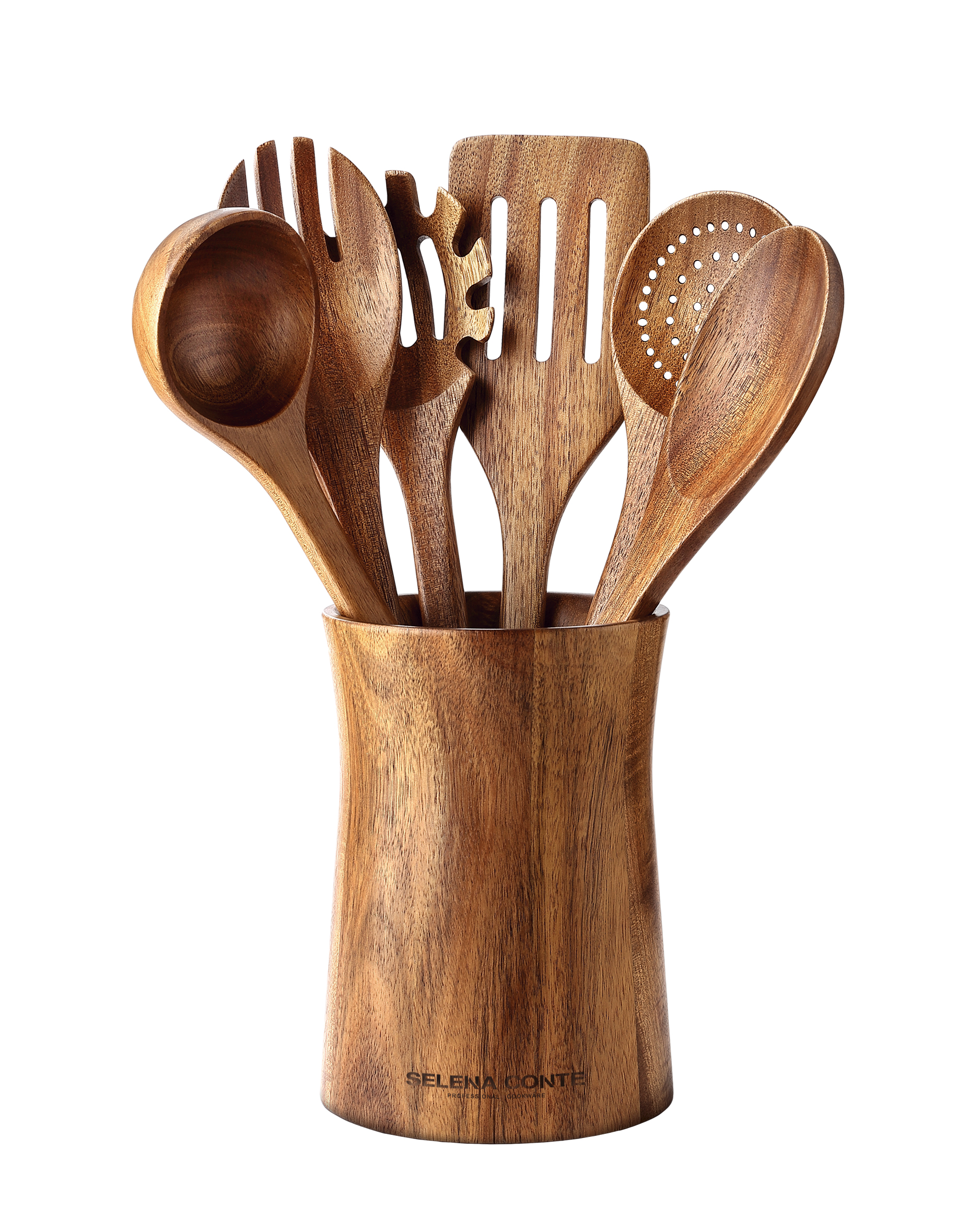 Набор кухонных аксессуаров из 6 предметов на подставке. В комплекте: половник, шумовка, салатная вилка, салатная ложка, ложка для спагетти, лопатка с прорезями. Материал: акация