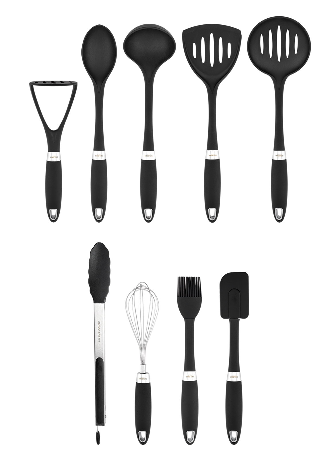 Набор кухонных аксессуаров из 9 предметов на подставке. В комплекте: лопатка, лопатка с прорезями, шумовка, половник, ложка, толкушка, кисточка, лопатка маленькая, венчик. Материал: нейлон, пластик, термопластичная резина, цинковый сплав, нержавеющая сталь. Цвет: черный