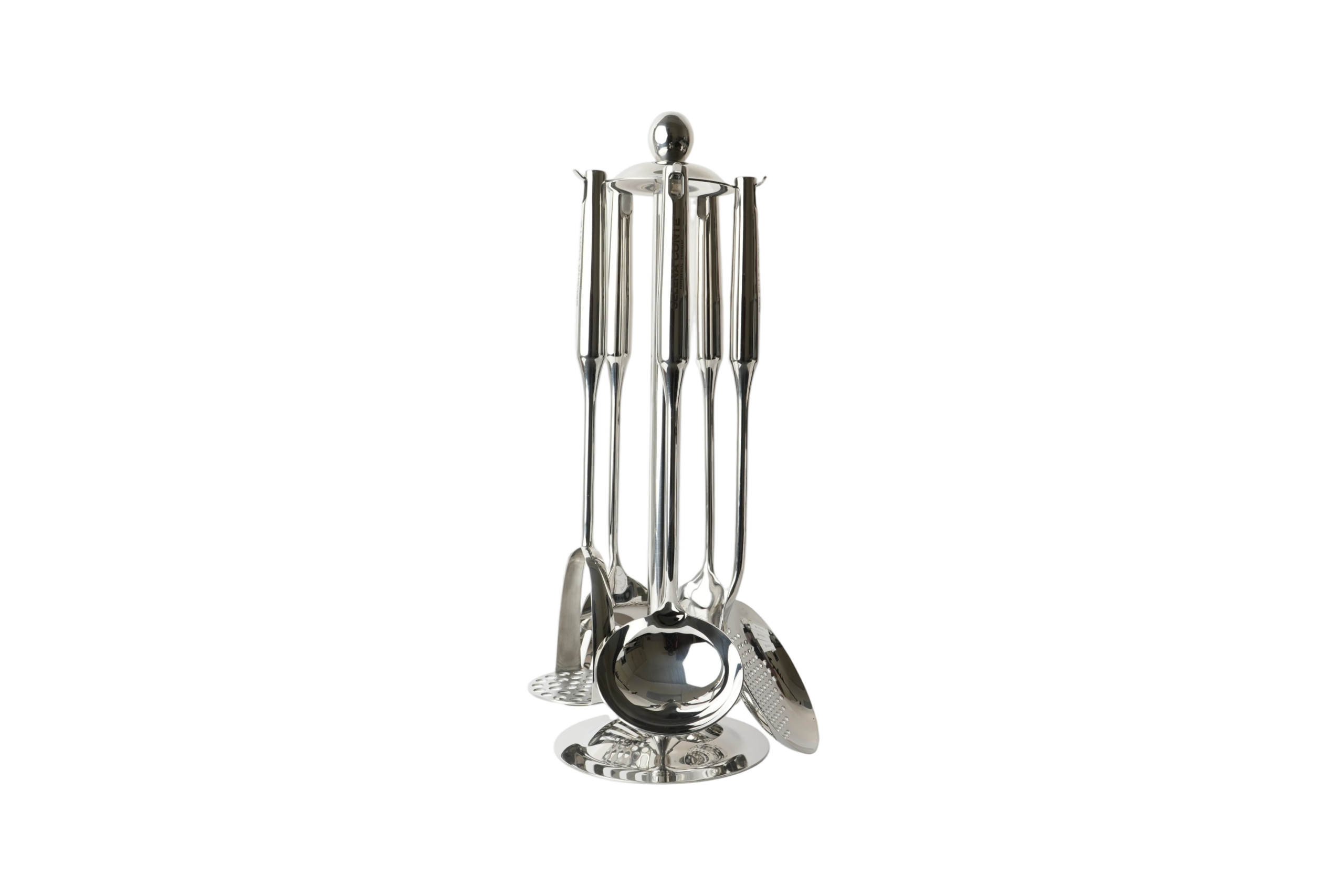 Набор кухонных аксессуаров из 5 предметов на подставке. В комплекте: шумовка, половник, лопатка с прорезями, ложка, толкушка. Материал: нержавеющая сталь 18/10. Полирование: зеркальное