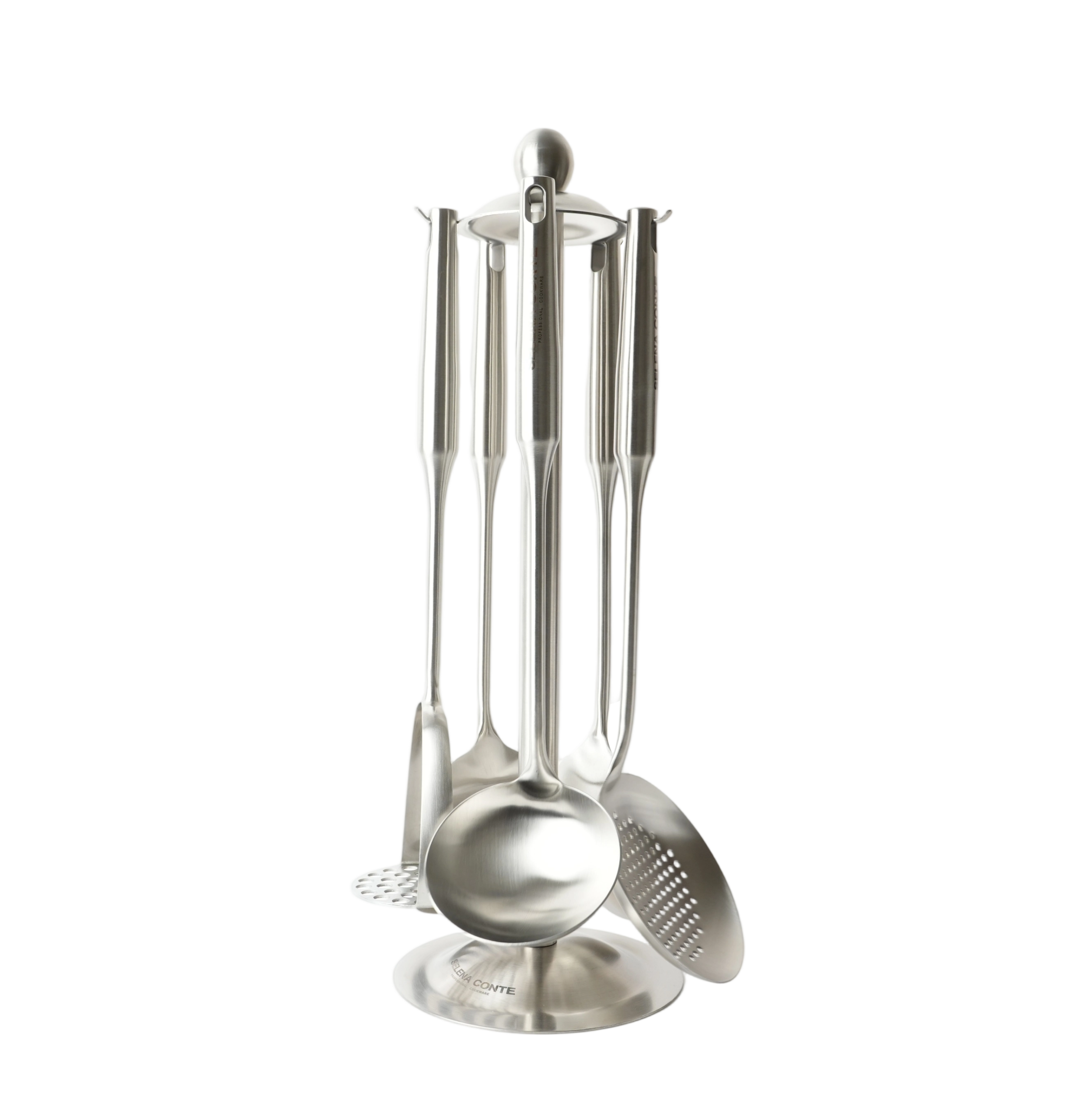 Набор кухонных аксессуаров из 5 предметов на подставке. В комплекте: шумовка, половник, лопатка с прорезями, ложка, толкушка. Материал: нержавеющая сталь 18/10. Полирование: матовое