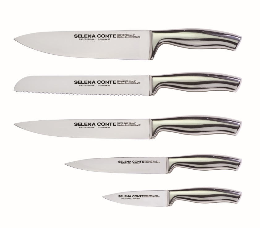 Набор кухонных ножей из 5 предметов на подставке. В комплекте: нож поварской 20см, нож для хлеба 20см, нож разделочный 20см, нож универсальный 13см, нож для чистки овощей 9см. Материал лезвия: углеродистая сталь X50Cr15Mov. Материал ручек ножей: нержавеющая сталь. Полирование: зеркальное. Материал подставки: акация.
