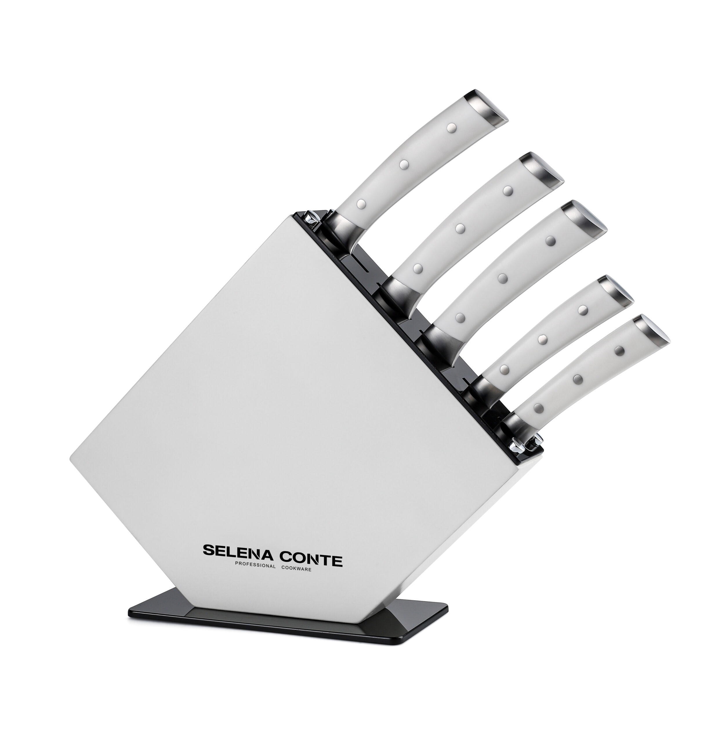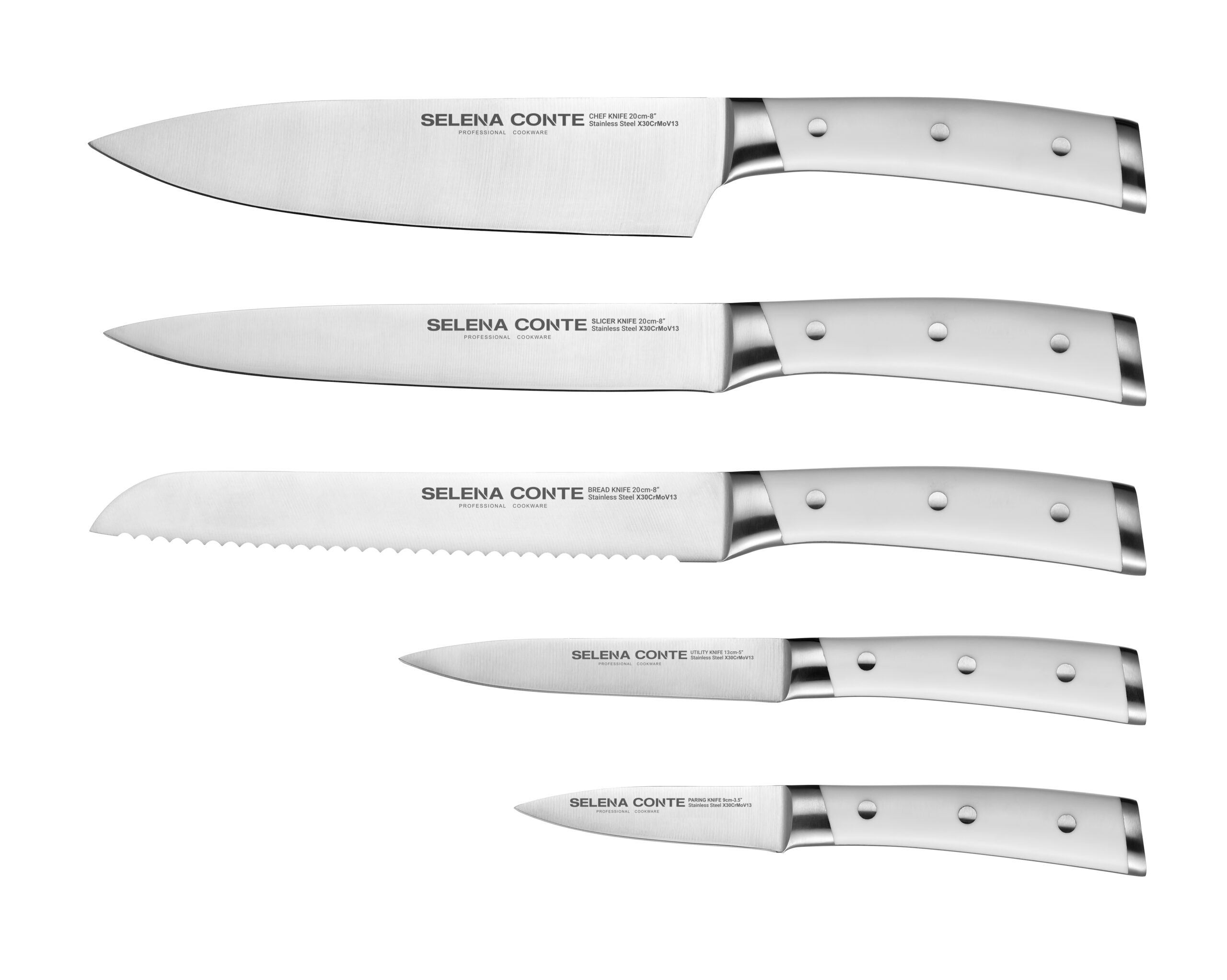 Набор кухонных ножей из 5 предметов на подставке. В комплекте: нож поварской 20см, нож для хлеба 20см, нож разделочный 20см, нож универсальный 13см, нож для чистки овощей 9см. Материал лезвия: углеродистая сталь X30Cr13MoV. Цвет: белый