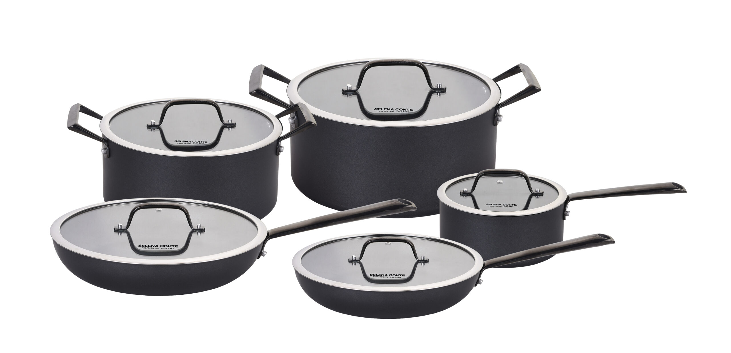 Набор посуды из 10 предметов. В комплекте: ковш 18×8,5см/2л, кастрюли 24х11,5см/5л, 28х12,5см/7,4л, сковороды 24х4,5см, 28×5,5см, со стеклянными крышками. Материал: кованый алюминий, нержавеющая сталь. Премиальное керамическое покрытие Rhitz. Индукционное дно. Цвет: черный