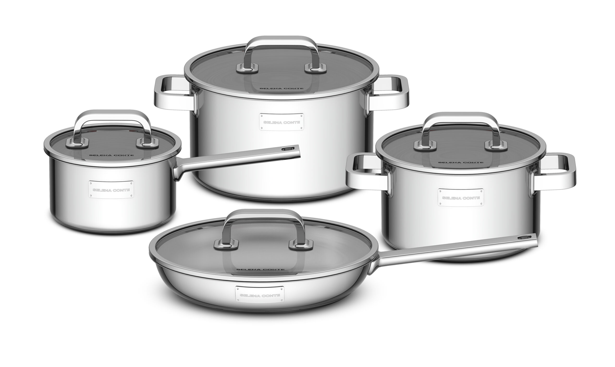 Набор посуды из 8 предметов. В комплекте: ковш 16х9см/1,8л, кастрюля 20х11,5см/3,5л, кастрюля 24х14см/6,3л, сковорода 26х4,8см со стеклянными крышками. Индукционное капсульное дно. Материал: нержавеющая сталь 18/10, стекло. Толщина: 0,7мм. Цвет силикона: черный. Полирование: матовое.