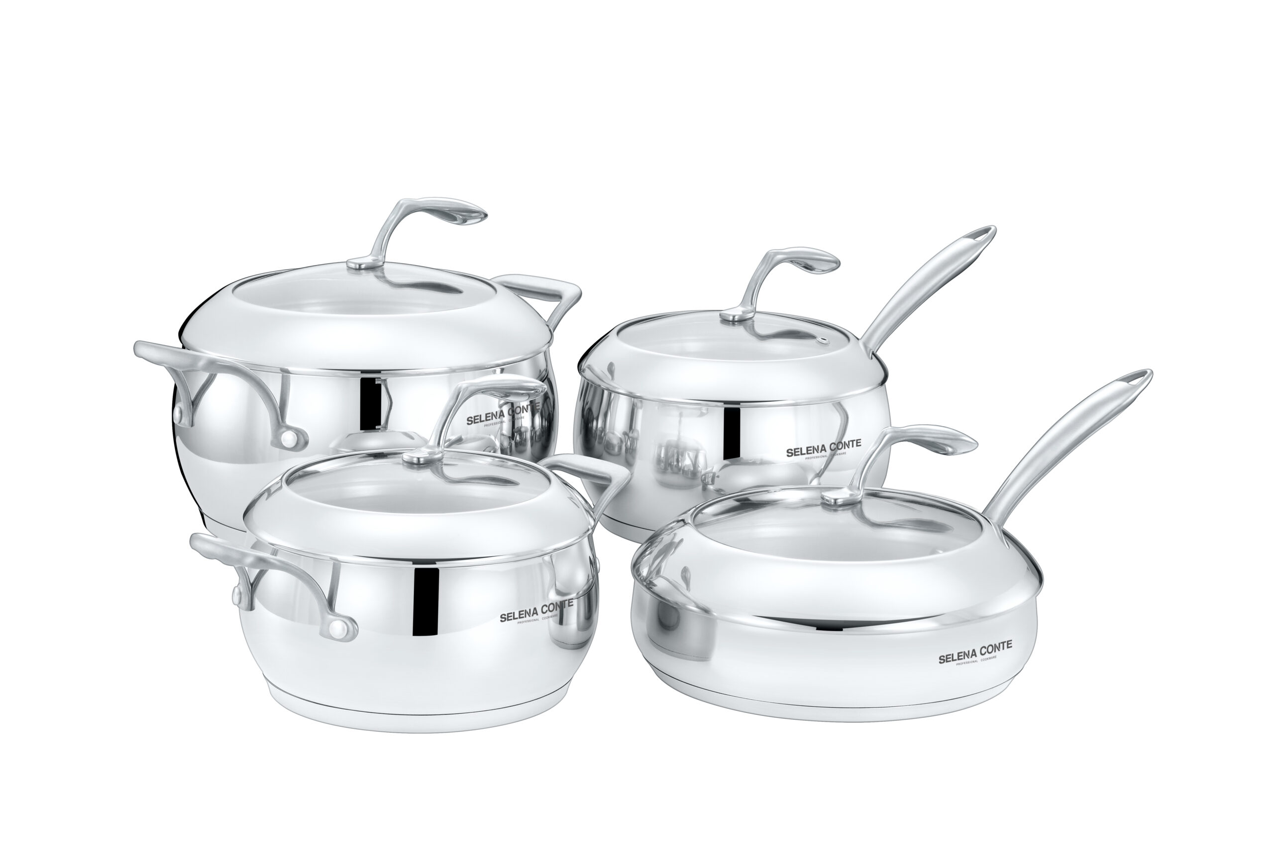 Набор посуды из 8 предметов. В комплекте: ковш 20х9,5см/3л, сковорода-сотейник 24х5см/2,3л, кастрюля 20х9,5см/3л, кастрюля 24х11,5см/5,2л со стеклянными крышками. Индукционное капсульное дно. Материал: нержавеющая сталь 18/10, стекло. Толщина: 0,8мм. Полирование: зеркальное.