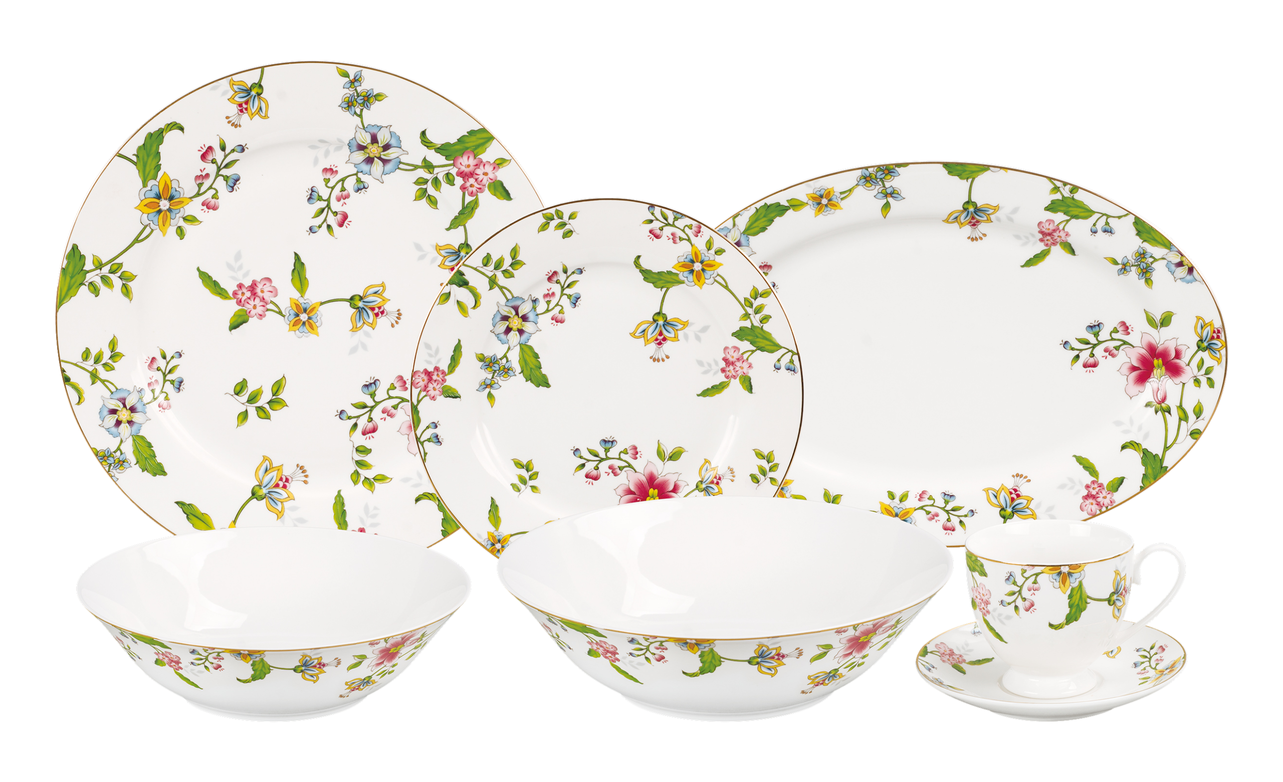 Сервиз столовый на 6 персон, 32 предмета (тарелка столовая 27см 6шт, тарелка десертная 20см 6 шт, тарелка суповая 18см 6шт, чашка 220мл 6шт, блюдце 15см 6шт, сервировочная тарелка 30см, салатная тарелка 23см). Материал: новый костяной фарфор.