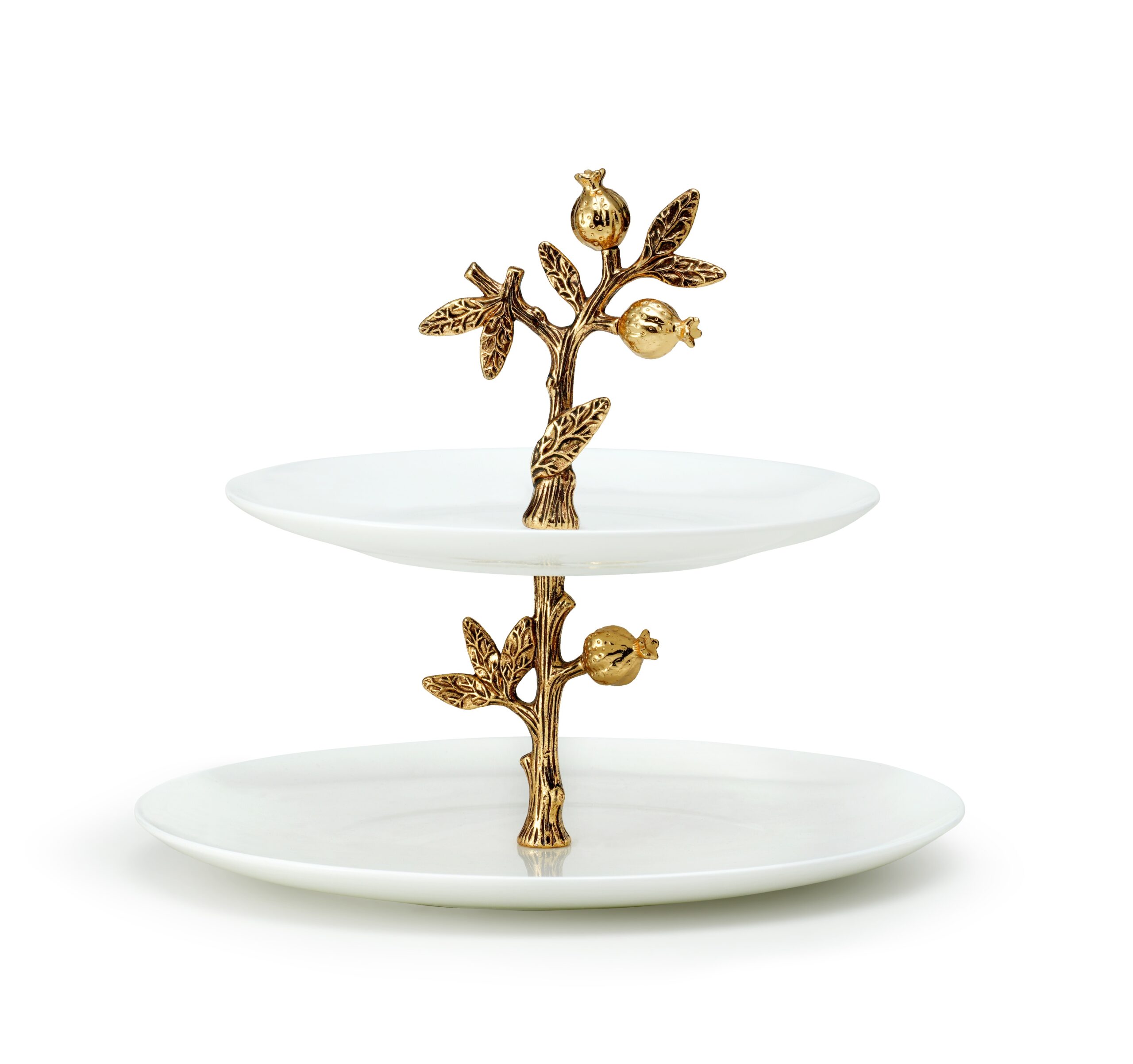 Этажерка сервировочная двухъярусная, диаметр 18см, 23см, высота 23см. Декор: гранат. Материал: костяной фарфор, сталь, цинковый сплав. Цвет: золотой